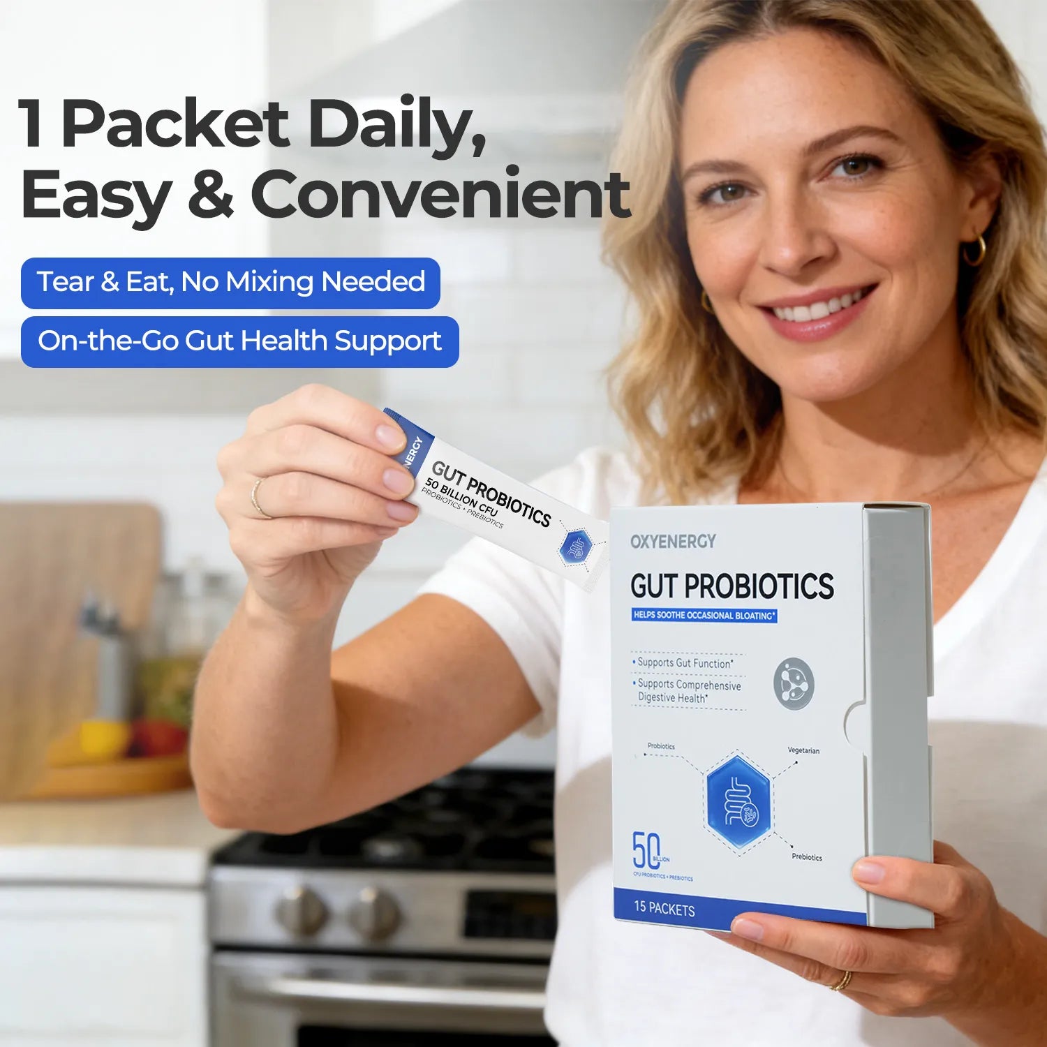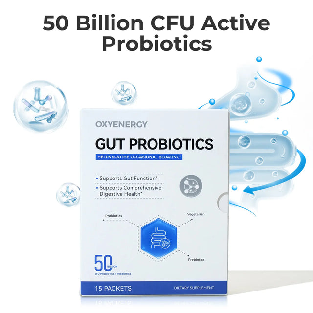 GUT PROBIOTICS contains 50 billion CFU probiotics + prebiotics, which supports comprehensive digestive health, supports gut function, and helps soothe occasional bloating.* Scientific, safe and long-lasting.